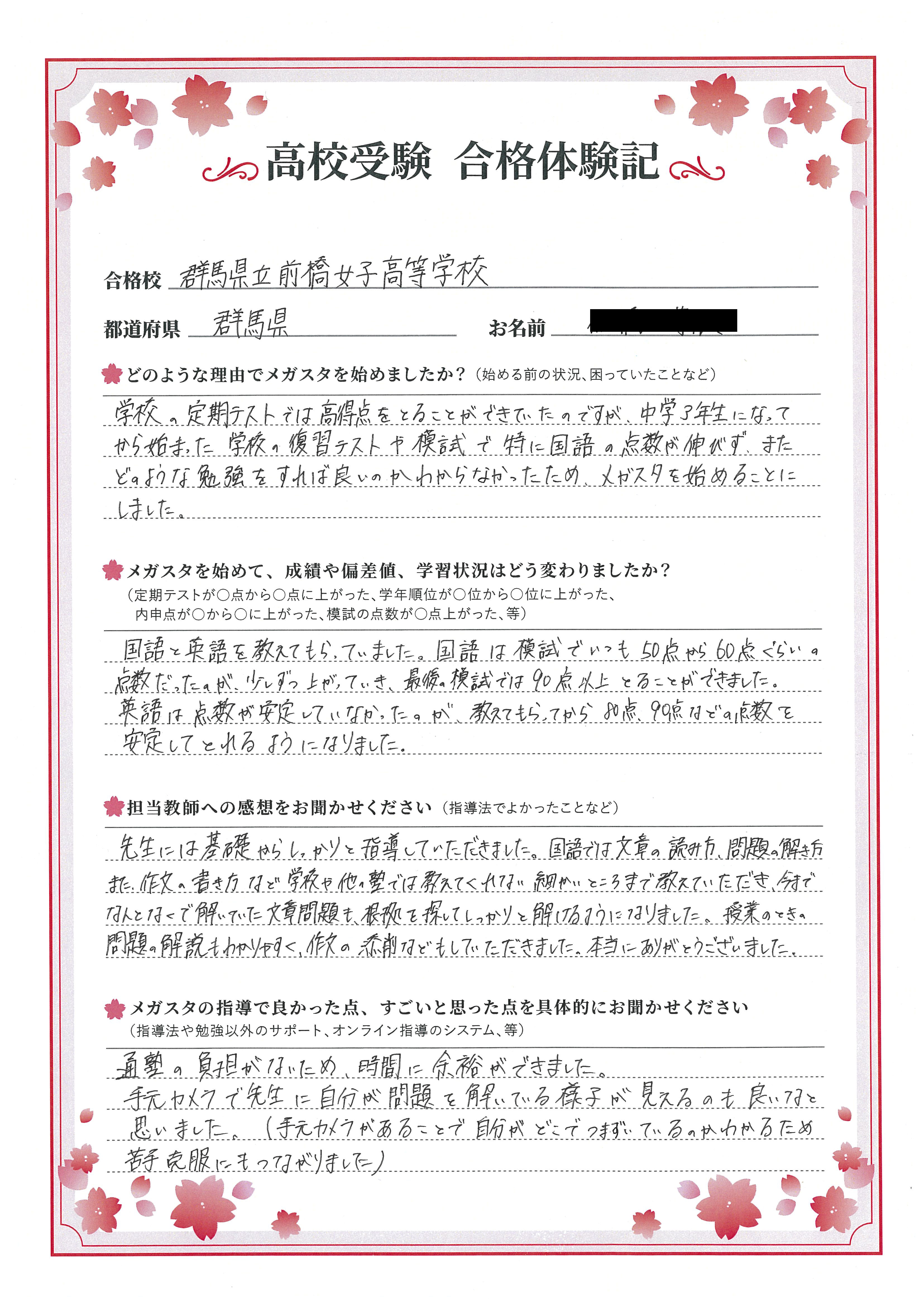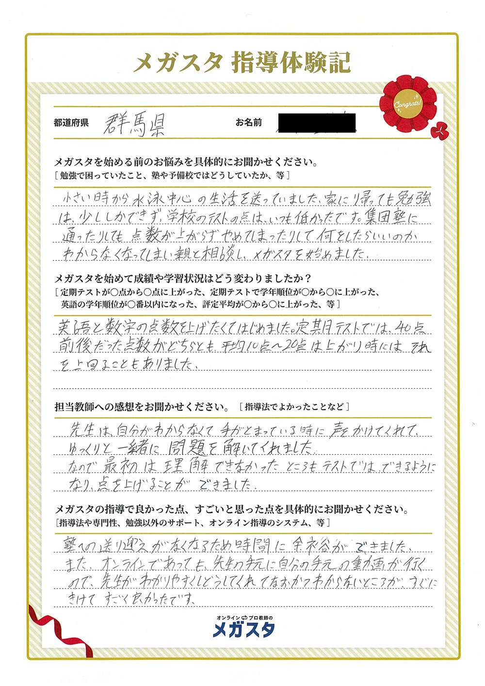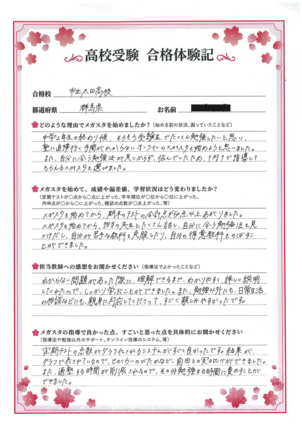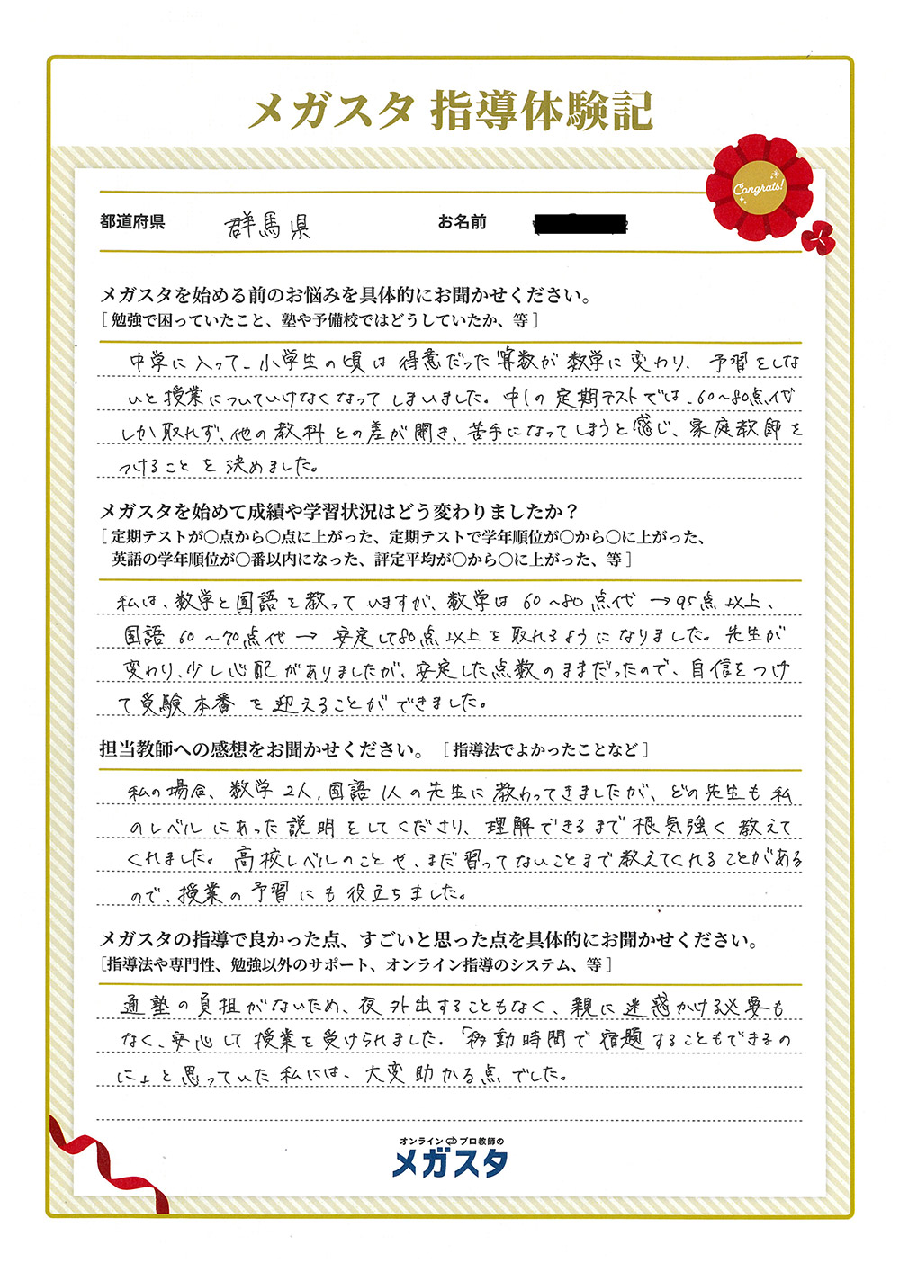 メガスタ群馬県校に届いた生徒さんのよろこびの声をほんの一部だけご紹介します。