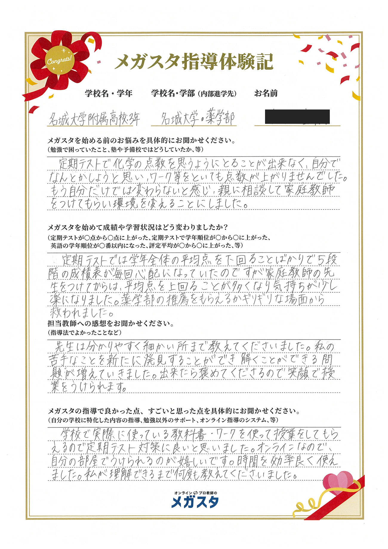 定期テストでは学年全体の平均点を下回ることばかりで5段階の成績表が毎回心配になっていたのですが家庭教師の先生をつけてからは、平均点を上回ることが多くなり気持ちが少し楽になりました。薬学部の推薦をもらえるかギリギリな場面から救われました。