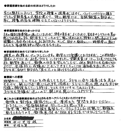 全ての教科において、学校の授業の進度が速く、ついていけない様子でした。定期考査の点数も悪くて、特に数学では白紙回答の部分が多く、授業内容を理解できていないようでした。