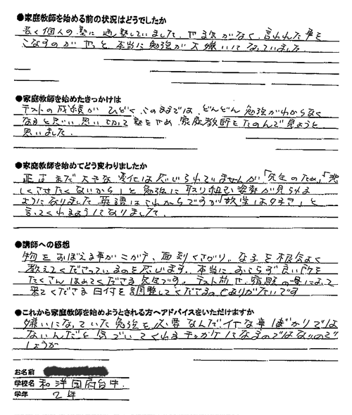 正直まだ大きな変化は感じられませんが、「先生のため」「悲しませたくないから」と勉強に取り組む姿勢が見られるようになりました。英語はこれからですが、「数学は好き」と言ってくれるようになりました。
