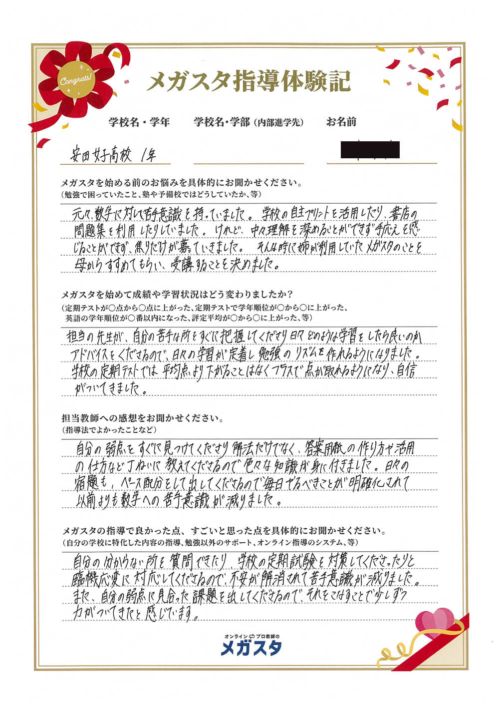 自分の弱点をすぐに見つけてくださり、解法だけでなく答案用紙の作り方や活用の仕方など丁寧に教えてくださるので色々な知識が身につきました。日々の宿題も、ペース配分をして出してくださるので、毎日やるべきことが明確化されて以前よりも数学への苦手意識が減りました。