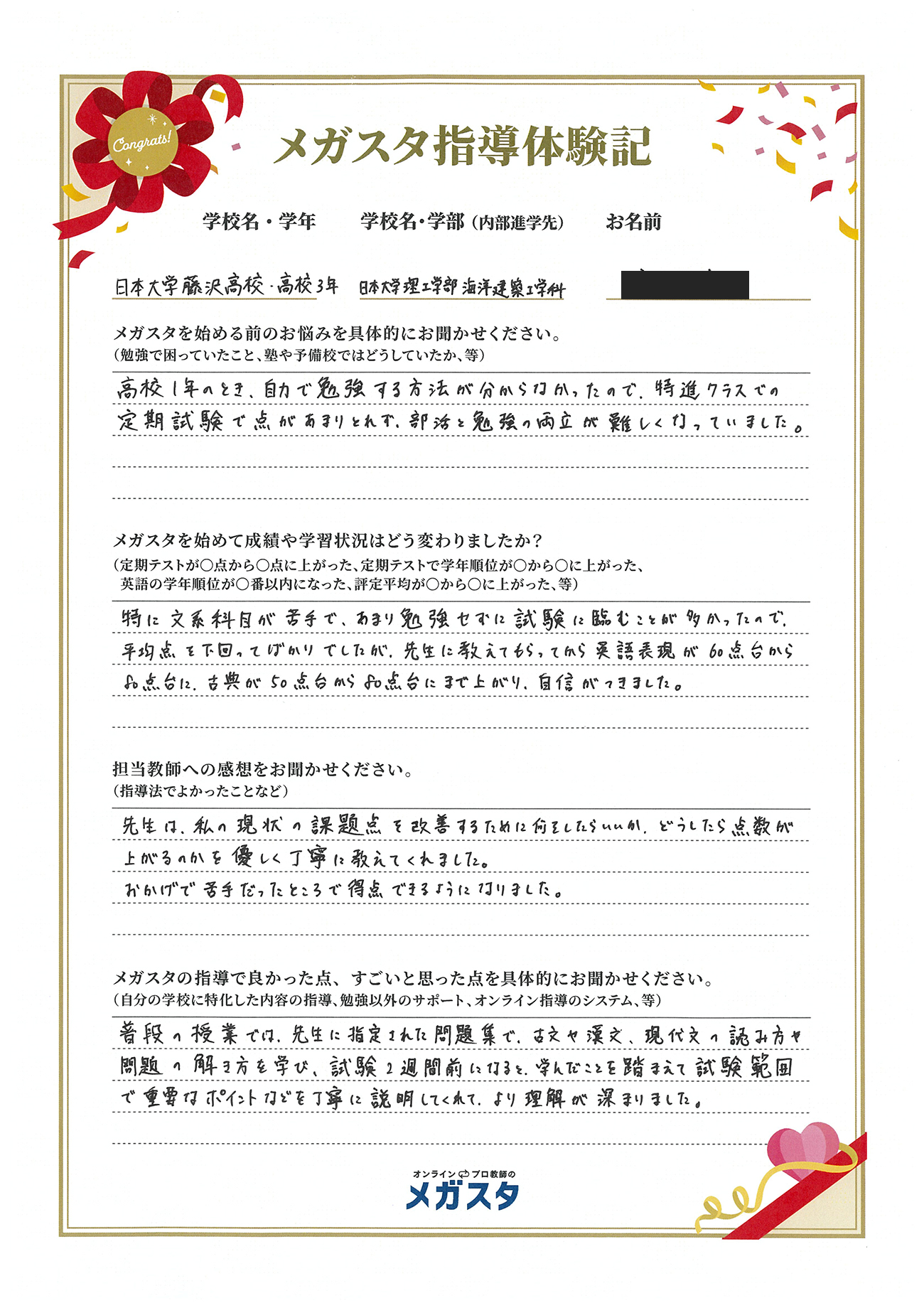 メガスタでは、これまで、数多くの日本大学藤沢高校・中学のお子さんを指導してきました。メガスタのオンラインプロ教師が日本大学藤沢高校・中学に通うご家庭から選ばれるのには理由があります。