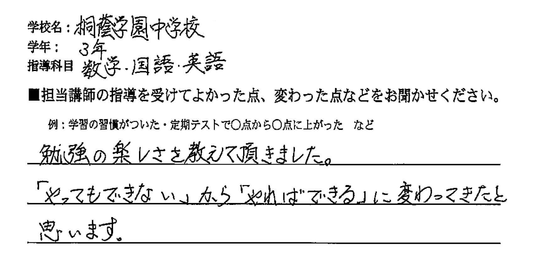 勉強の楽しさを教えて頂きました。「やってもできない」から「やればできる」に変わってきたと思います。