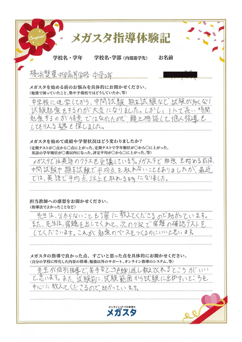 メガスタでは英語のクラスを受講しています。メガスタで勉強を始める前は、中間試験や期末試験で平均点を取れないこともありましたが、最近では、英語で平均点以上を取れるようになりました。