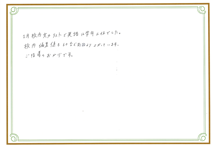 1月校内実力テストで英語は学年上位でした。校内偏差値も60台で前回より上がっています。ご指導のおかげです。