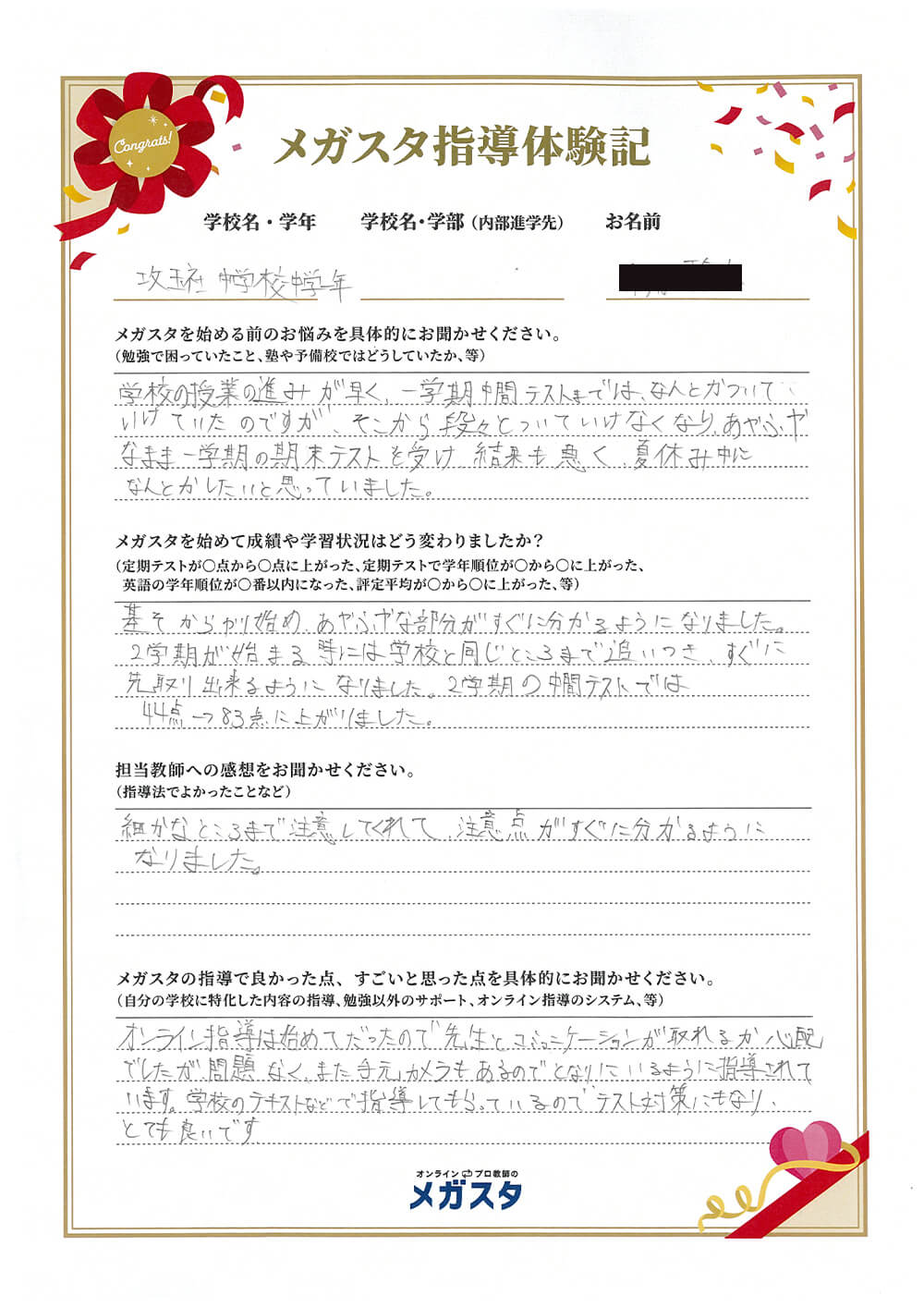 定期テストの難度はやや高くなっていますが、授業内容がきちんと理解できれいれば問題ありません。