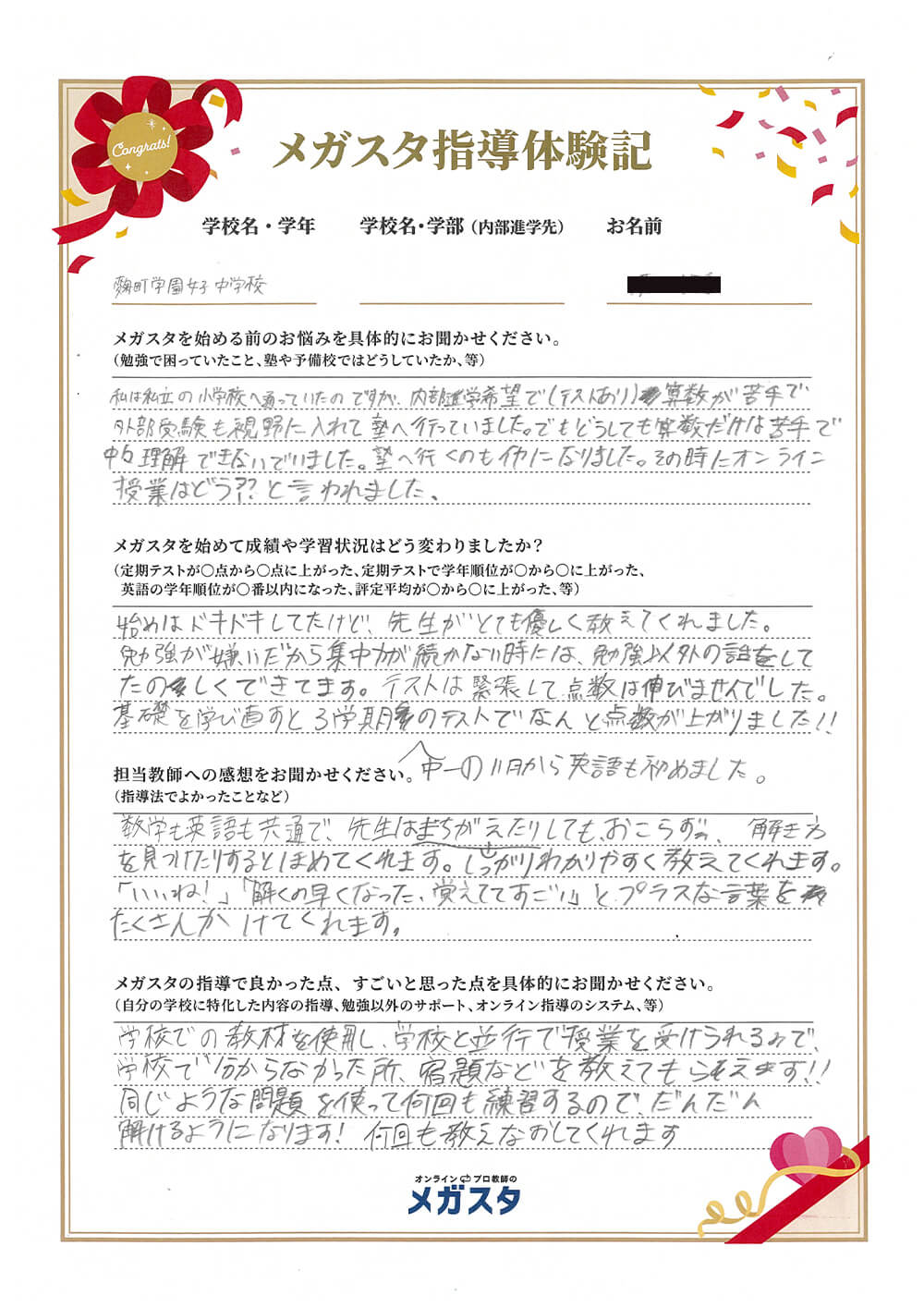 メガスタでは、これまで、数多くの麹町学園女子中学・高校のお子さんを指導してきました。メガスタのオンラインプロ教師が麹町学園女子中学・高校に通うご家庭から選ばれるのには理由があります。
