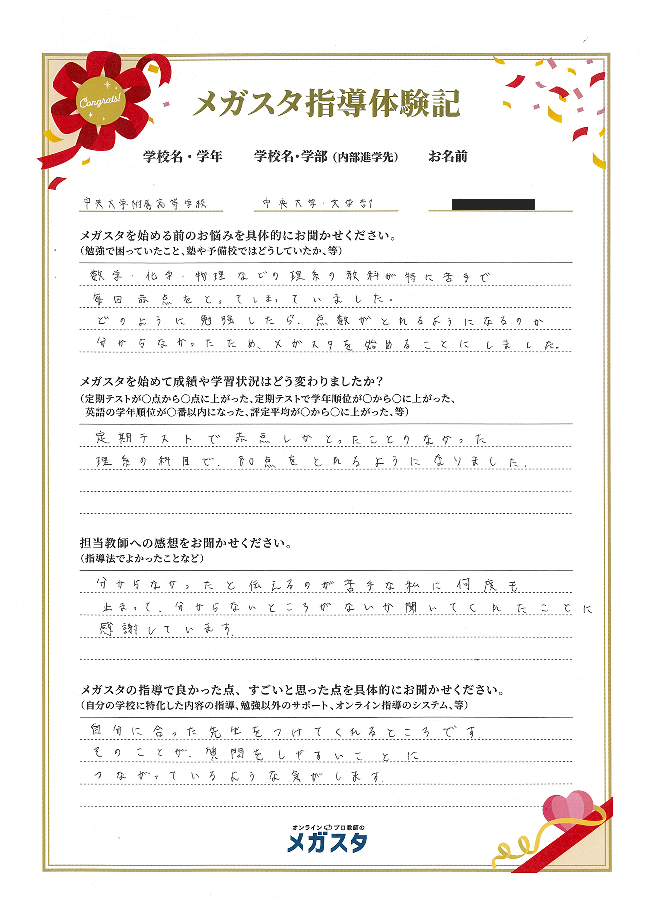 メガスタで成績が上がった! 中央大学附属中学・高校の