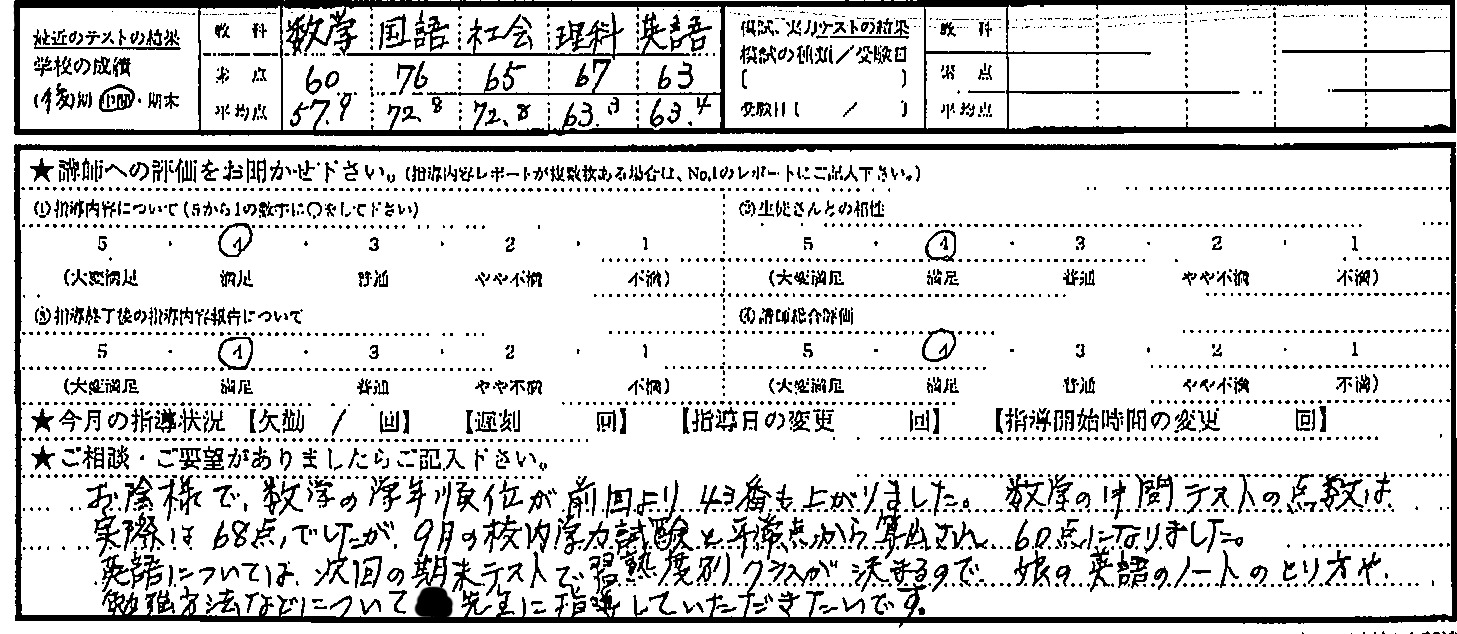 お陰様で、数学の学年順位が前回より43番も上がりました。数学の中間テストの点数は実際は68点でしたが、9月の構内学力試験と平常点から算出 され60点になりました。